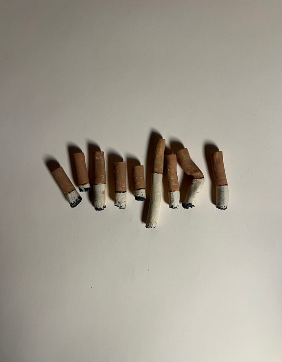Anya Ulinich turns our attention to post-consumer trash through the 16th-century French relief pottery style of Palissy. To tell her stories, she often uses rats and debris rendered in glossy glaze. A departure from her bright palettes, these handmade ceramic cigarettes are a piece of that crowded, tactile world, an intimate fragment of her sculptural reliefs.