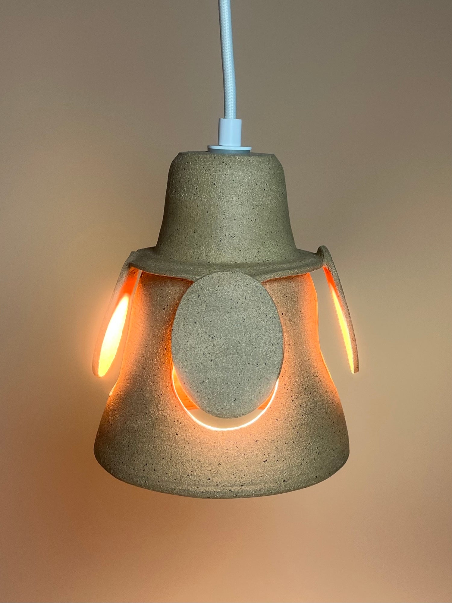 A sculptural pendant light with a playful, almost anthropomorphic silhouette. The matte earth-tone glaze and balanced geometry giving it an animated presence. Beneath, a wash of orange glaze lends a warm inner glow, giving light a sunlit, lived-in warmth.