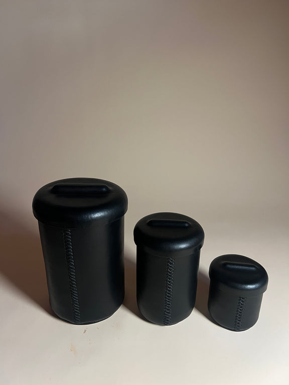 Nic Der’s leather canisters are hand-stitched from thick, vegetable-tanned hides that age beautifully over time. Their sculptural simplicity recalls early utilitarian design, blending function and quiet luxury.